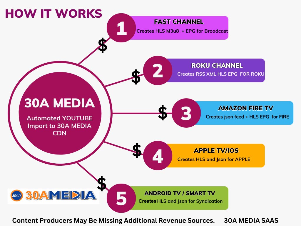 Adding your channel to these OTT and FAST platforms extends your brand reach from YouTube’s digital audience to millions of television viewers—opening new revenue streams and advertising partnerships through 30A Media’s syndication network.